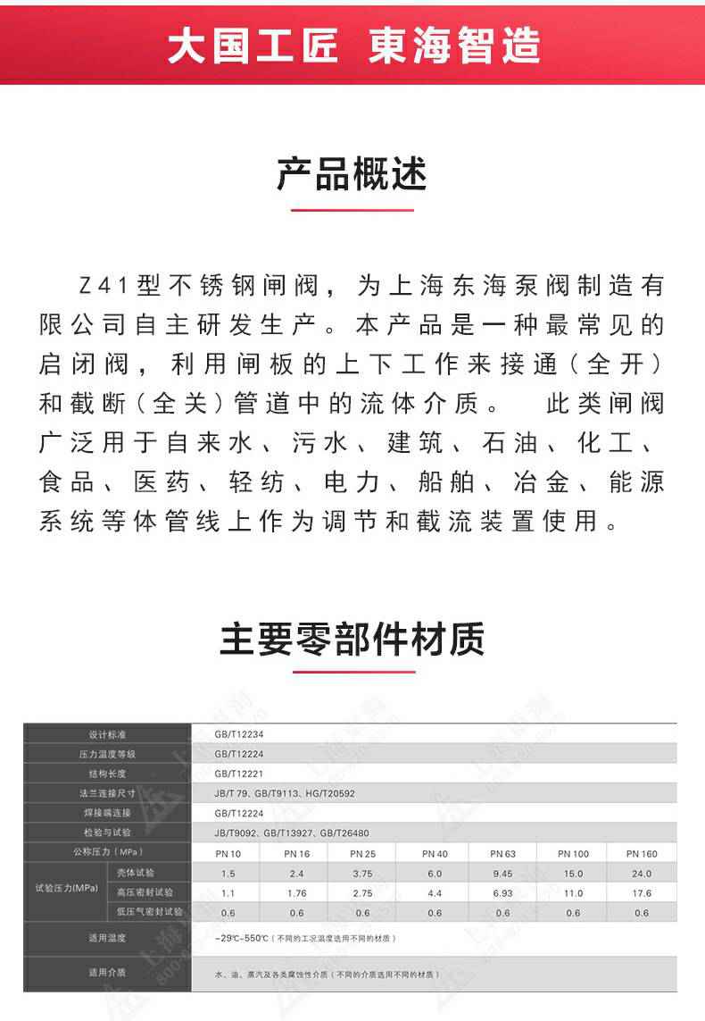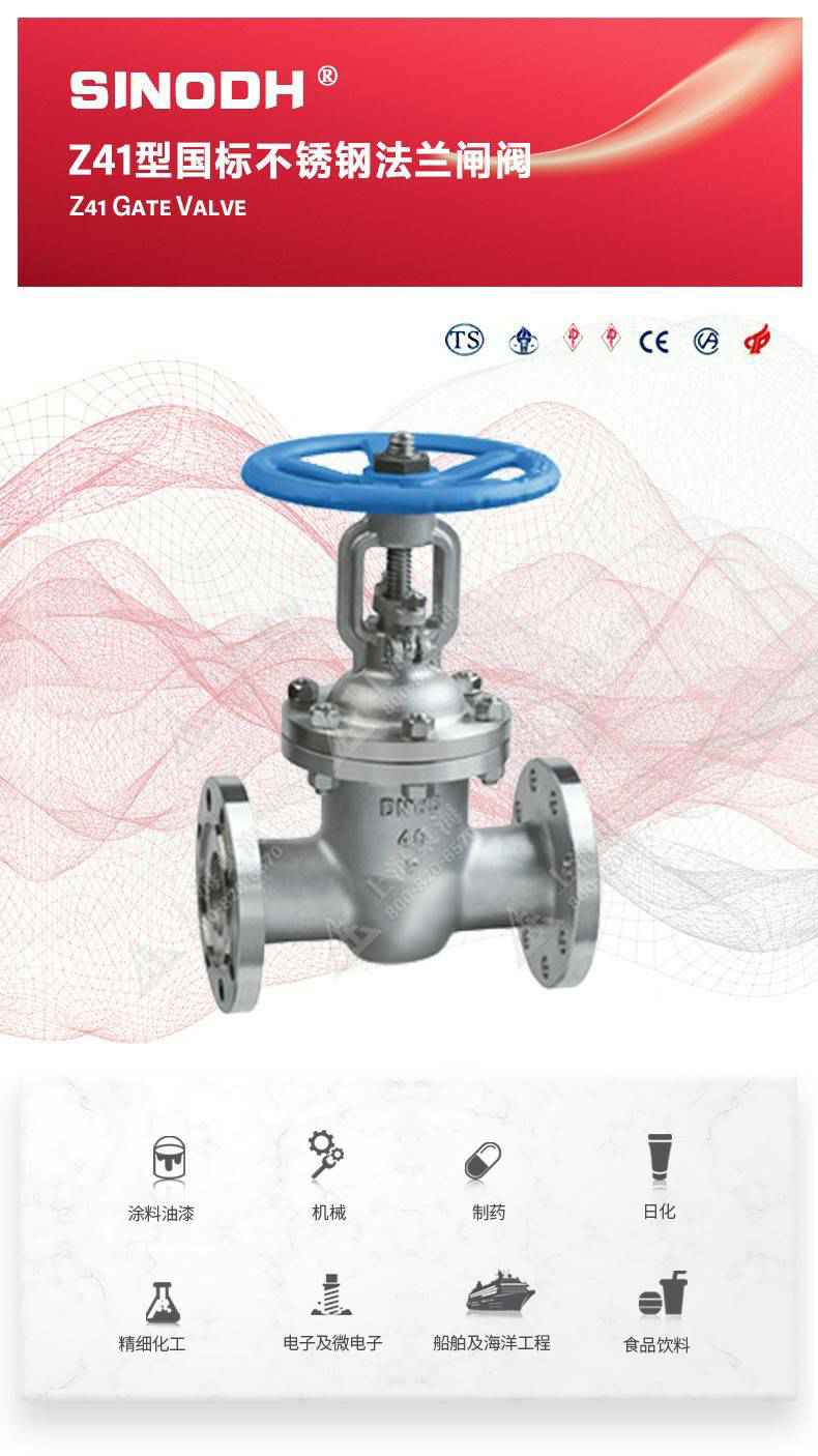 Z41型不锈钢闸阀,为乐鱼官方站页面登录入口-乐鱼(中国)自主研发生产。本产品是一种最常见的启闭阀,利用闸板的上下工作来接通(全开)和截断(全关)管道中的流体介质。此类闸阀广泛用于自来水、污水、建筑、石油、化工、食品、医药、轻纺、电力、船舶、冶金、能源系统等体管线上作为调节和截流装置使用。